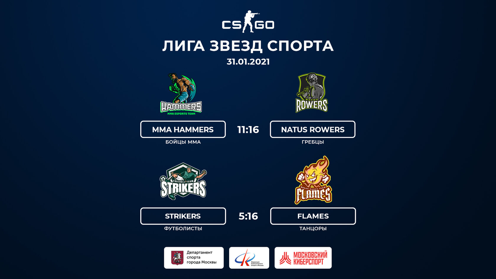 «Лига звезд спорта» по Counter-Strike: Global Offensive проводится в рамках проекта «Московский киберспорт» и при поддержке Департамента спорта города Москвы.